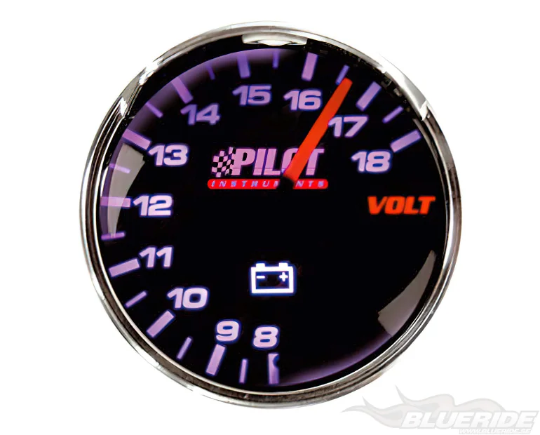 Voltmätare med 7 olika valbara färger, 270° vision/läs-skala, röd lysande nål, kupad smoke-lins, kromad ram med visir och switch under visiret för att ändra färg.