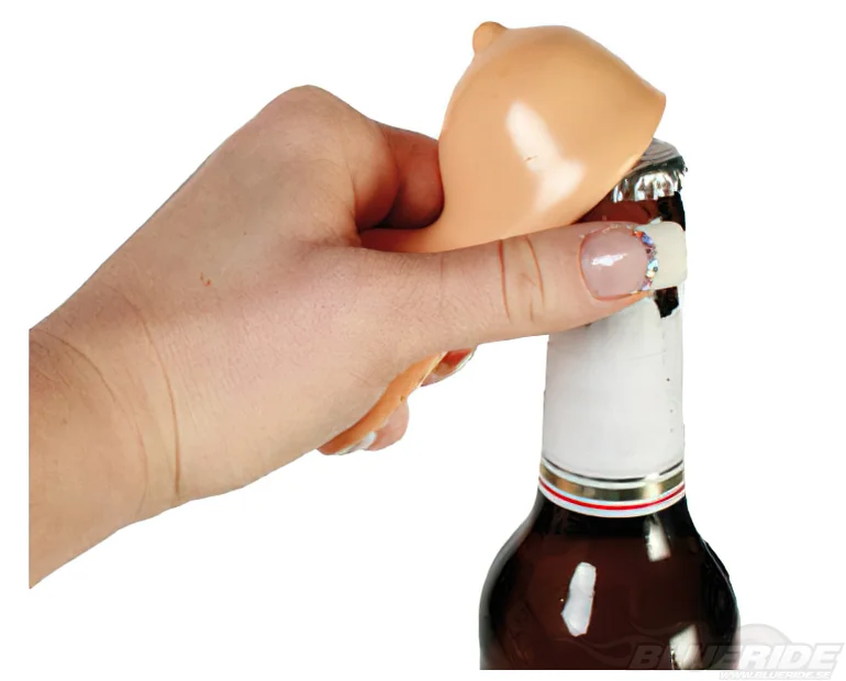 Kul kapsylöppnare där ovansidan är formad som två bröst. På undersidan sitter en kapsylöppnare i metall.