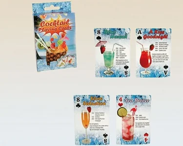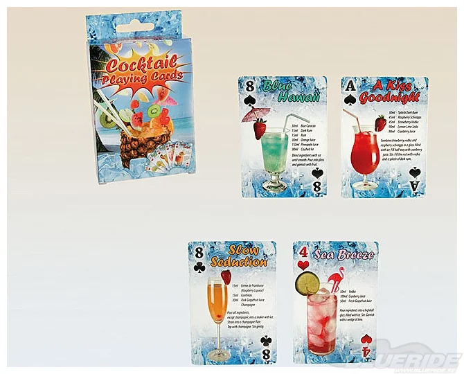 En helt vanlig kortlek med 52 kort, förutom att det står ett drinkrecept på varje kort.