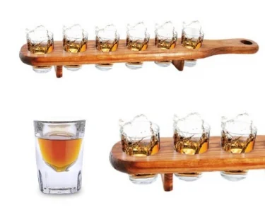 6 st snapsglas i glas och en hållare i trä för alla glasen. Hållaren har 6 st hål där du placerar glasen och ett handtag så du kan flytta den och ställa den snyggt på bordet, eller räcka den över till kompisen så du inte beh...