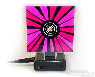 Lampa som lyser och blinkar. Skivan som lyser är endast någon millimeter tunn. Lampskivan kopplas in i en dosa. Sedan kan dosan kopplas till cigarettuttaget med en kabel som är 120 cm lång...