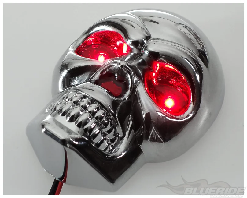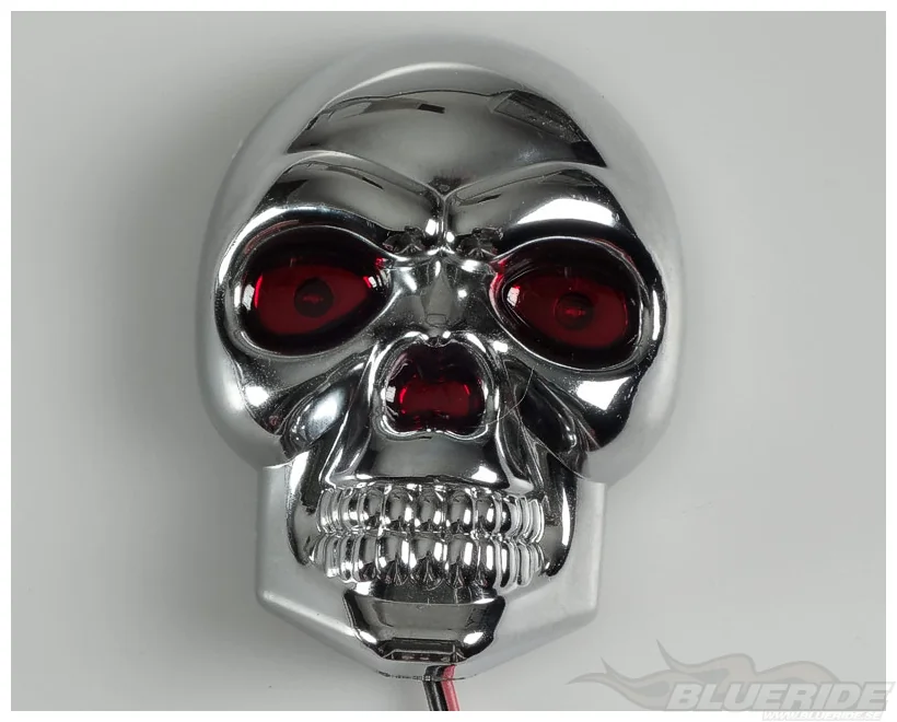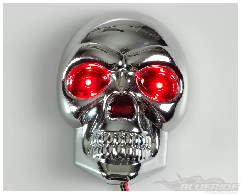 Kromad dödskalle med röda ögon. Varje öga har även en LED-diod, så när du kopplar ström till dödskallen så lyser ögonen med rött sken.