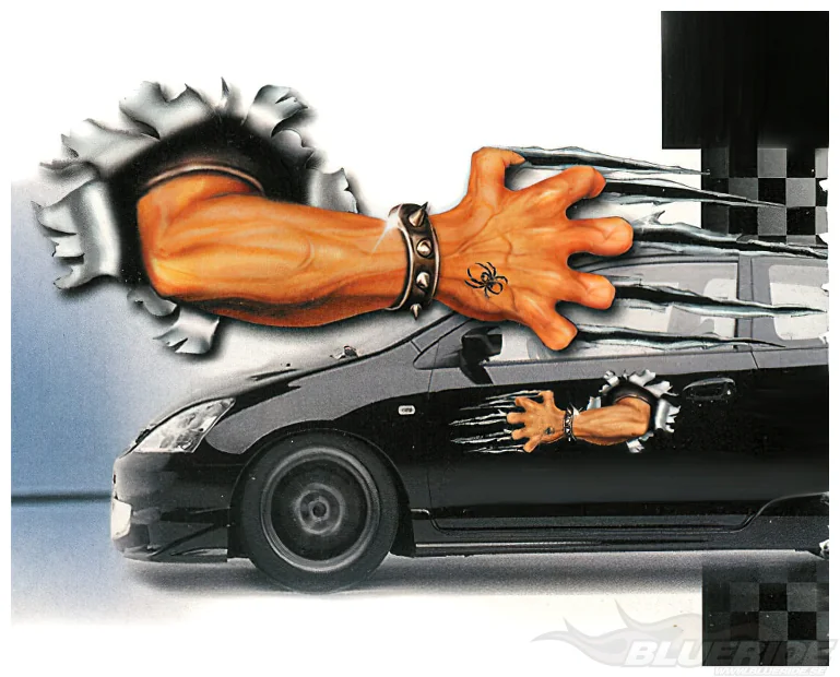 Två st snygga dekaler med motiv av en arm i fullfärg. Dekalen ger en illusion av att handen kommer ut ur föremålet som man fäster dekalen på, och river upp föremålet.