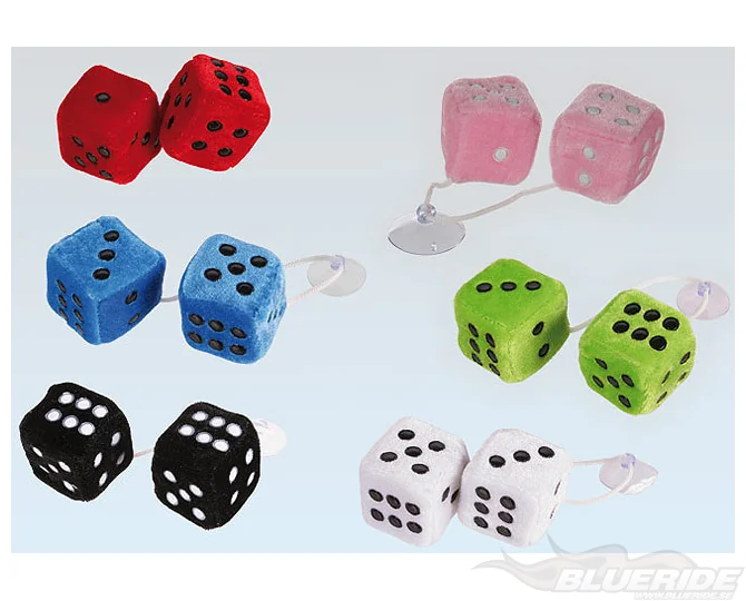 De klassiska tärningarna i ett mindre format. Två st mjuka tärningar som sitter samman med ett snöre, så du enkelt kan hänga dem i backspegeln eller på något annat ställe.
