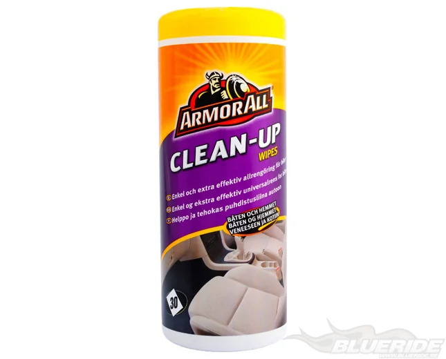 Armor All Clean-Up Wipes avlägsnar fastgrodd smuts utan att torka eller bleka ytan. Tillskottet av icke-anjoniska, ytaktiva ämnen gör servetten extremt effektiv även mot fet smuts. Produkten är ett ofarligt rengöringsmedel som ändå är tufft nog att hantera svår smuts, men likväl oskadlig för de flesta ytor ut- och invändigt i bilen. En ypperlig fläckborttagare för säten.