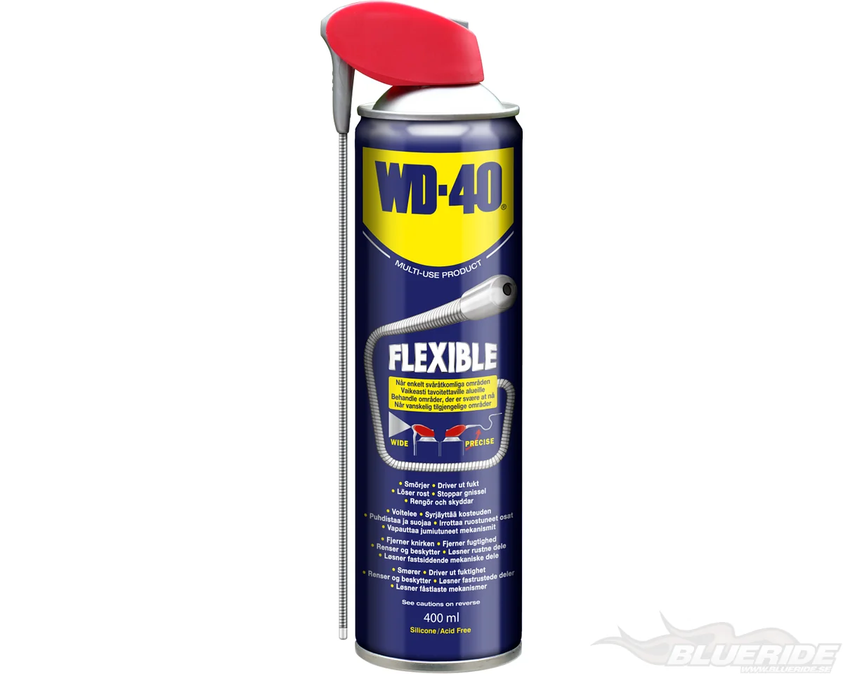 WD-40 Flexible är en uppgraderad version av populära WD-40 SmartStraw. Med användarens behov i fokus har denna WD-40 Flexible Multispray försetts med ett 18 cm lång flexibelt appliceringsrör som enkelt kan böjas och riktas till önskad form. Med appliceringsröret uppfällt sprayas produkten med precision och kan med hjälp av det flexibla appliceringsröret enklare nå svåråtkomliga ställen. Med appliceringsröret är nedfällt sprayas produkten brett och rikligt. 360°-ventilen gör att burken kan användas i alla möjliga vinklar och riktningar - även upp och ner.
