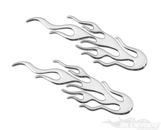 Två st kromade flames tillverkad av 3M material som fästs med dubbelhäftande tejp som medföljer.