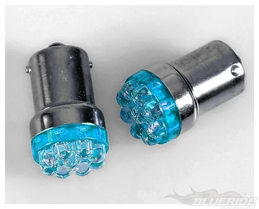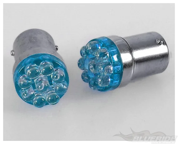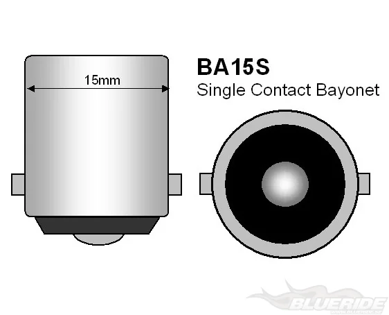 Glödlampan har sockelutförande BA15s och lyser med blått ljus.