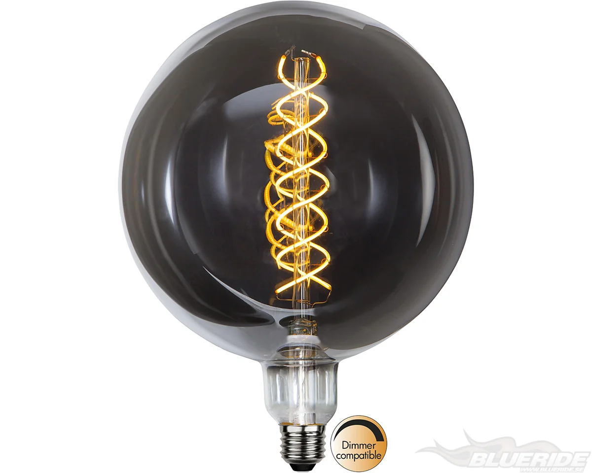 Den har rökigt glas med varmvitt sken. Lampan är dimmerkompatibel och har E27-sockel.