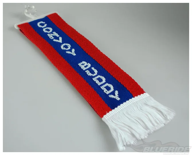 Texten är broderad och i färgerna rött, blått och vitt.