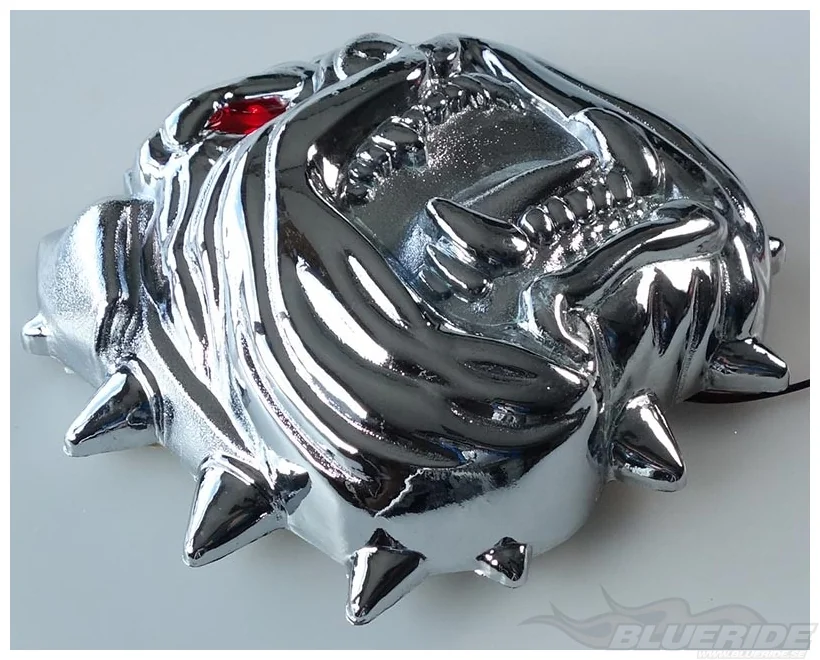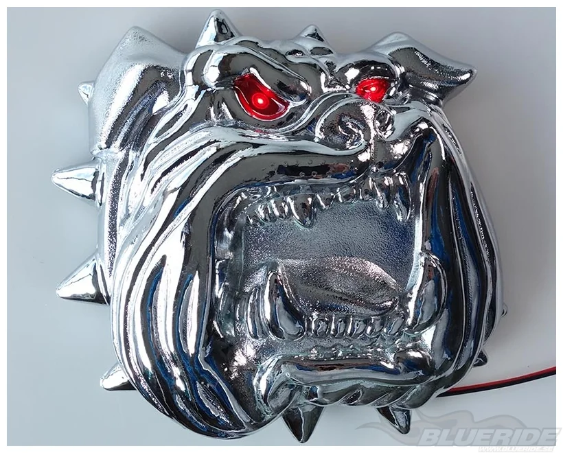 Ett kromat huvud av en bulldogg med röda ögon med LED-ljus.