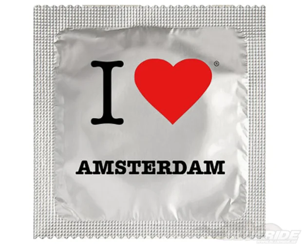 1 st kondom med texten ″I Love Amsterdam″ tryckt på förpackningen.