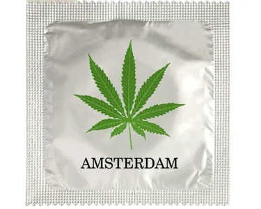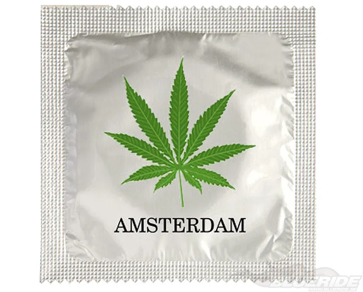 1 st kondom med texten ″Amsterdam″ tryckt på förpackningen.