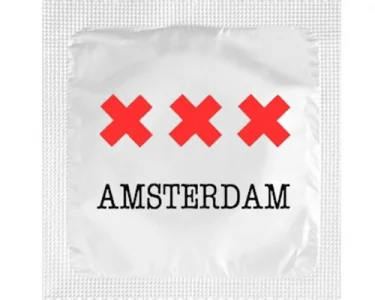 1 st kondom med texten ″XXX Amsterdam″ tryckt på förpackningen.