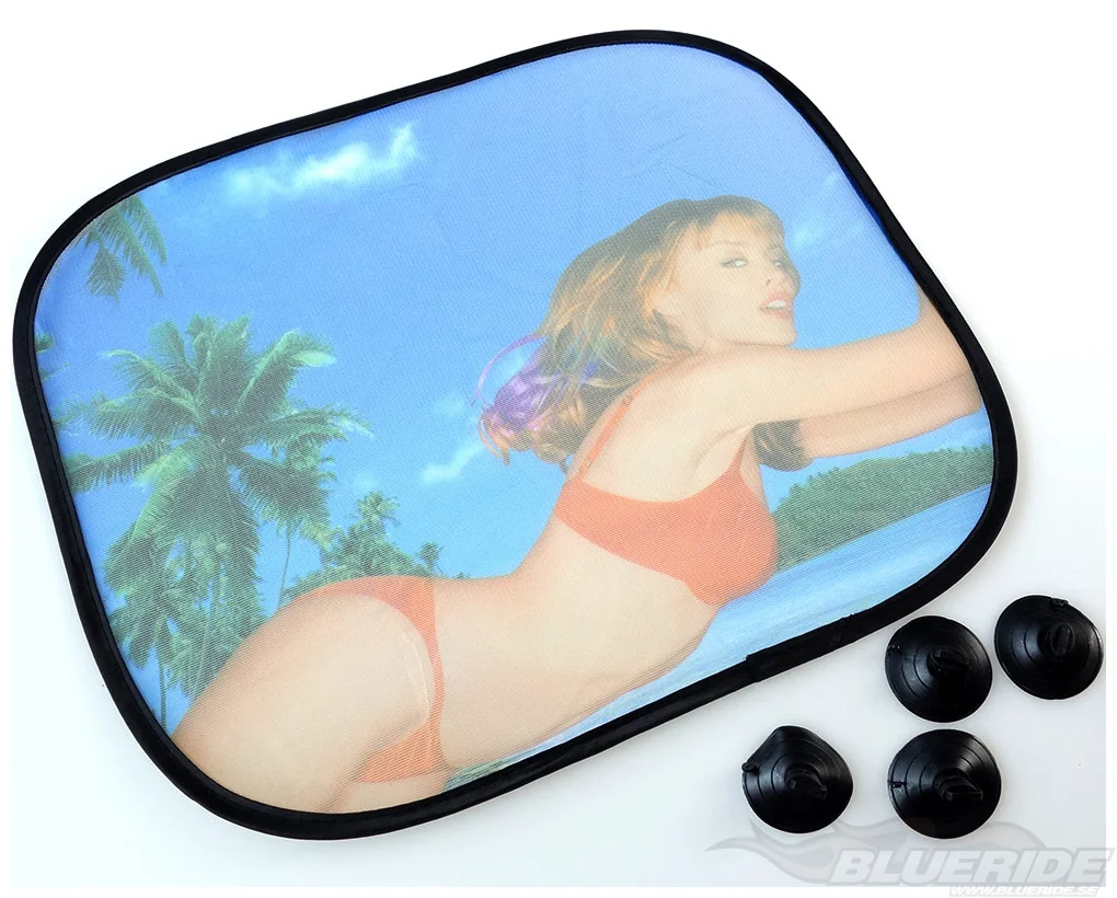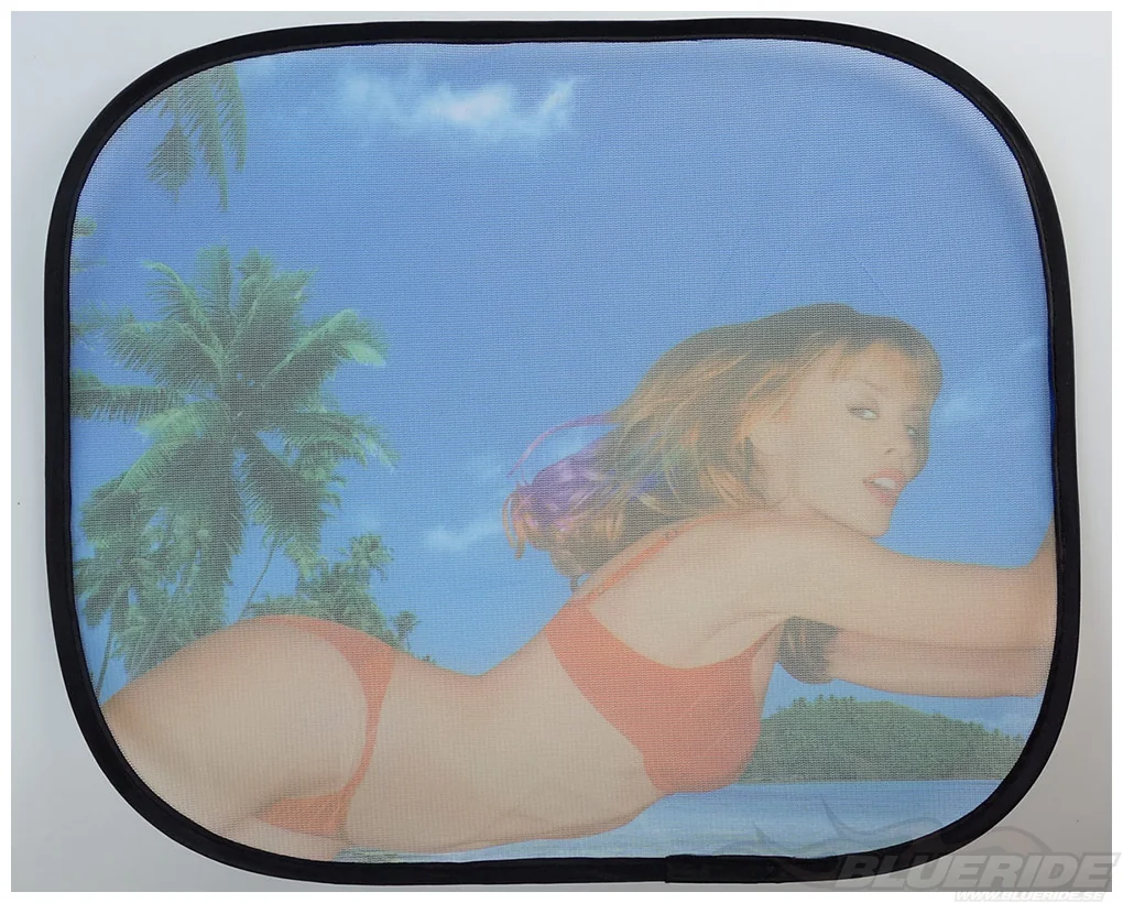 Två st solskydd med motiv på en tjej i bikini. Varje solskydd är 44 x 36 cm, och 4 st sugproppar medföljer så att det kan fästas på rutan.