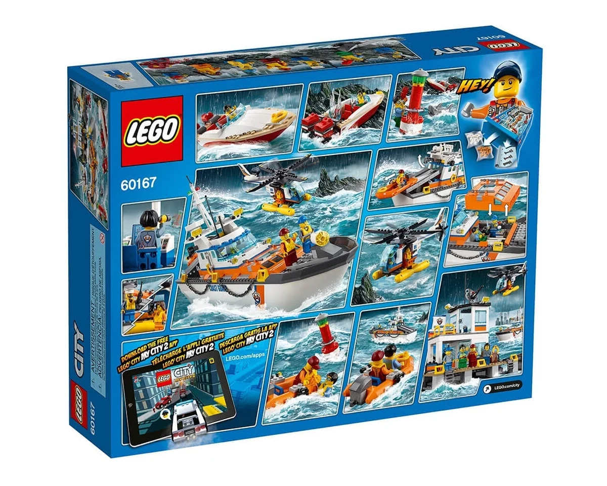 Sätt på flytvästen som medlem av LEGO® City personalen på Kustbevakningens högkvarter med två våningar, kontor och rörlig radarantenn. Det finns också en båt med öppningsbar brygga och däck, rörlig radarantenn och sökljus, undersökningsutrymme och räddningsbåt med sjösättningsfunktion samt en helikopter med helikopterplatta, racerbåt och en byggbar boj. Innehåller sju minifigurer, plus haj och bläckfisk.