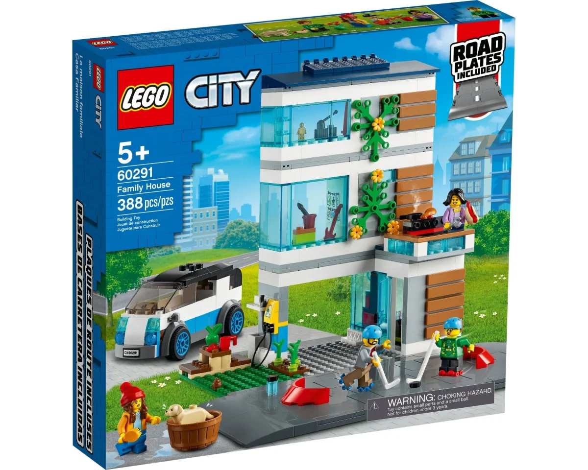 The LEGO® City Family House (60291) has a lounge, kitchen, hobby room, bedroom, bathroom and lots of green-living features, including toy solar panels, charging station and a cool EV. Kids can expand this playset using the included Road Plates to create their own city. And with a family of minifigures, plus a Labrador retriever figure, there′s everything they need for hours of imaginative role play.A great build-and-play experience for kids aged 5 and upThis playset includes an easy-to-follow building guide and Instructions PLUS – part of the free LEGO Building Instructions app for smartphones and tablets. This interactive construction guide with zoom and rotate viewing tools quickly helps young LEGO builders become master builders.Awesome toys for boys and girlsLEGO City building sets stimulate open-ended role play based on real-life events, with feature-rich buildings, realistic toy vehicles and fun characters that deliver an enjoyable, fun-filled, build-and-play experience.