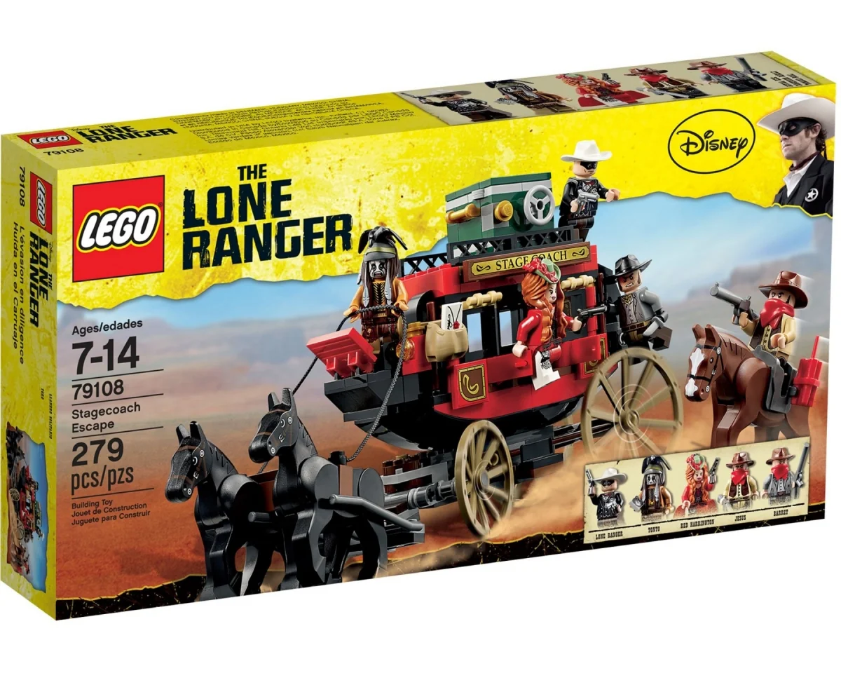 Look out for the bandits going after Red Harrington′s valuable silver locked in the vault in the Stagecoach Escape! Launch the baggage off the back to slow the bad guys down! Then jump down onto the galloping horses, detach them from the wagon and help the Lone Ranger and Tonto to chase the outlaws off before they steal the stash! Includes 5 minifigures with weapons and accessories: the Lone Ranger, Tonto, Red Harrington and 2 bandits, Jesus and Barret.