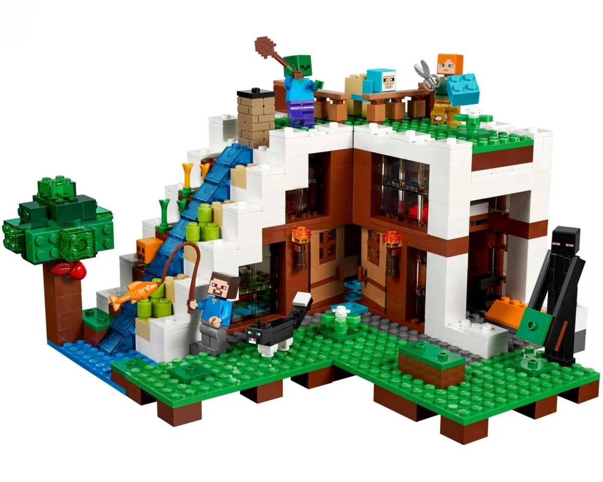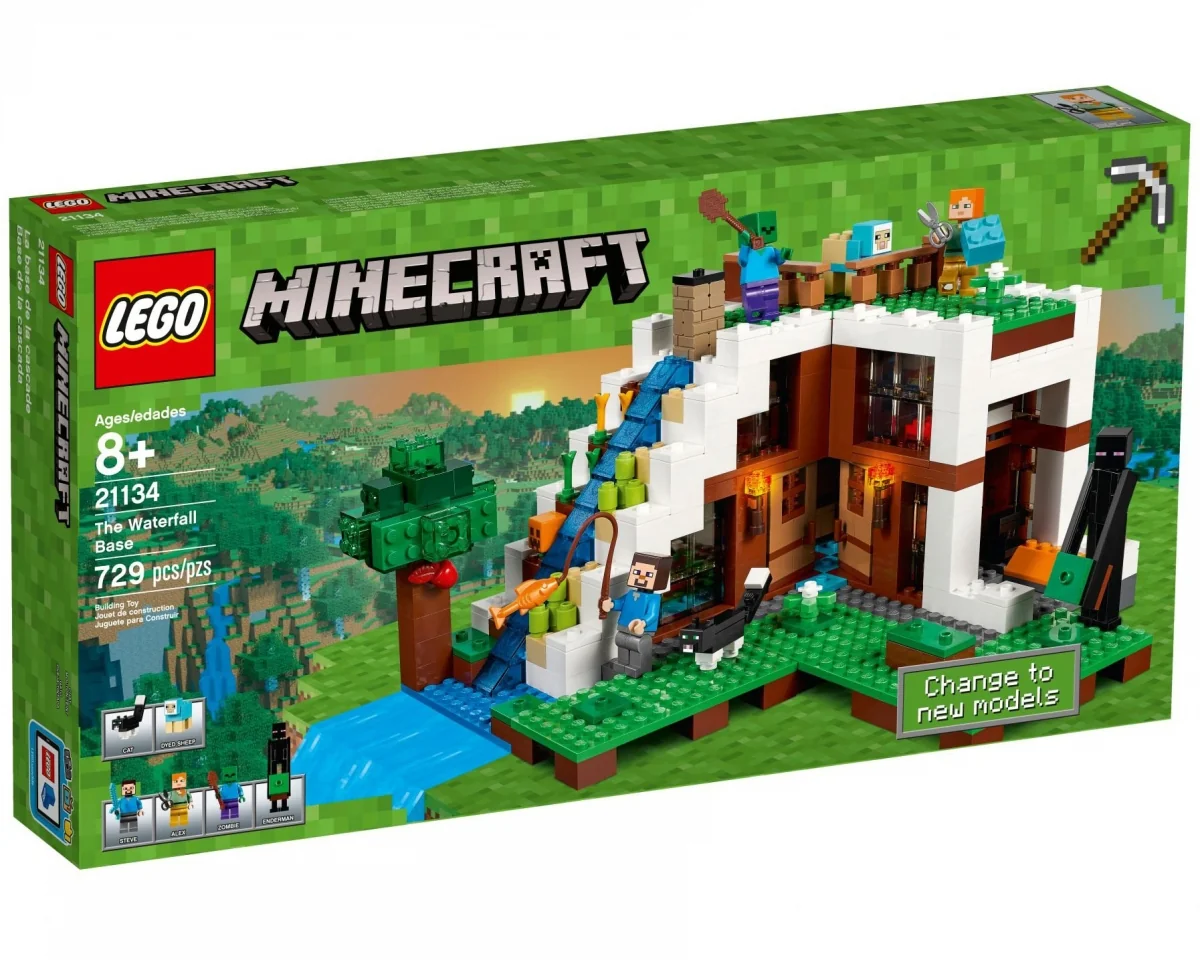 Lego Minecraft 21134, The Waterfall Base innehåller 729 st bitar och tillverkades 2017.
