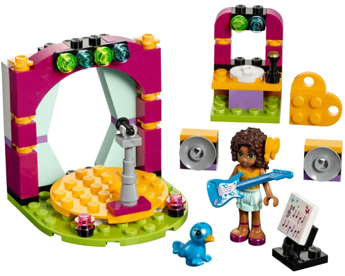 Play and perform with LEGO® Friends Andrea′s Musical Duet. Pop Cleo the parrot on the revolving bird stand, then help Andrea sound check her electric guitar and stand at the microphone. Give a great performanc...