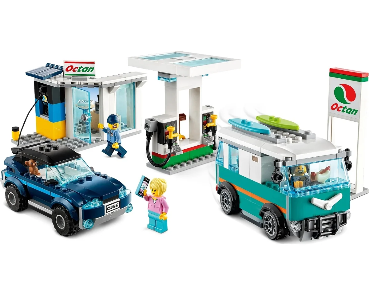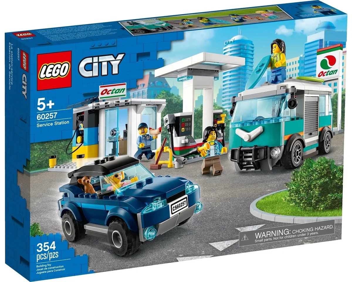Lego City 60257, Service Station. Legot innehåller 354 st bitar och tillverkades 2020. Antal minifigurer i legoförpackningen är 4 st. Service Station ingår i serien City, Service Station och tillhör underserien Town. Barn som gillar leksaksbilar lär älska leksetet LEGO® City Bensinstation (60257), med en bensinstation för elektriska och bensindrivna fordon. Du kan koppla in jeepen för...