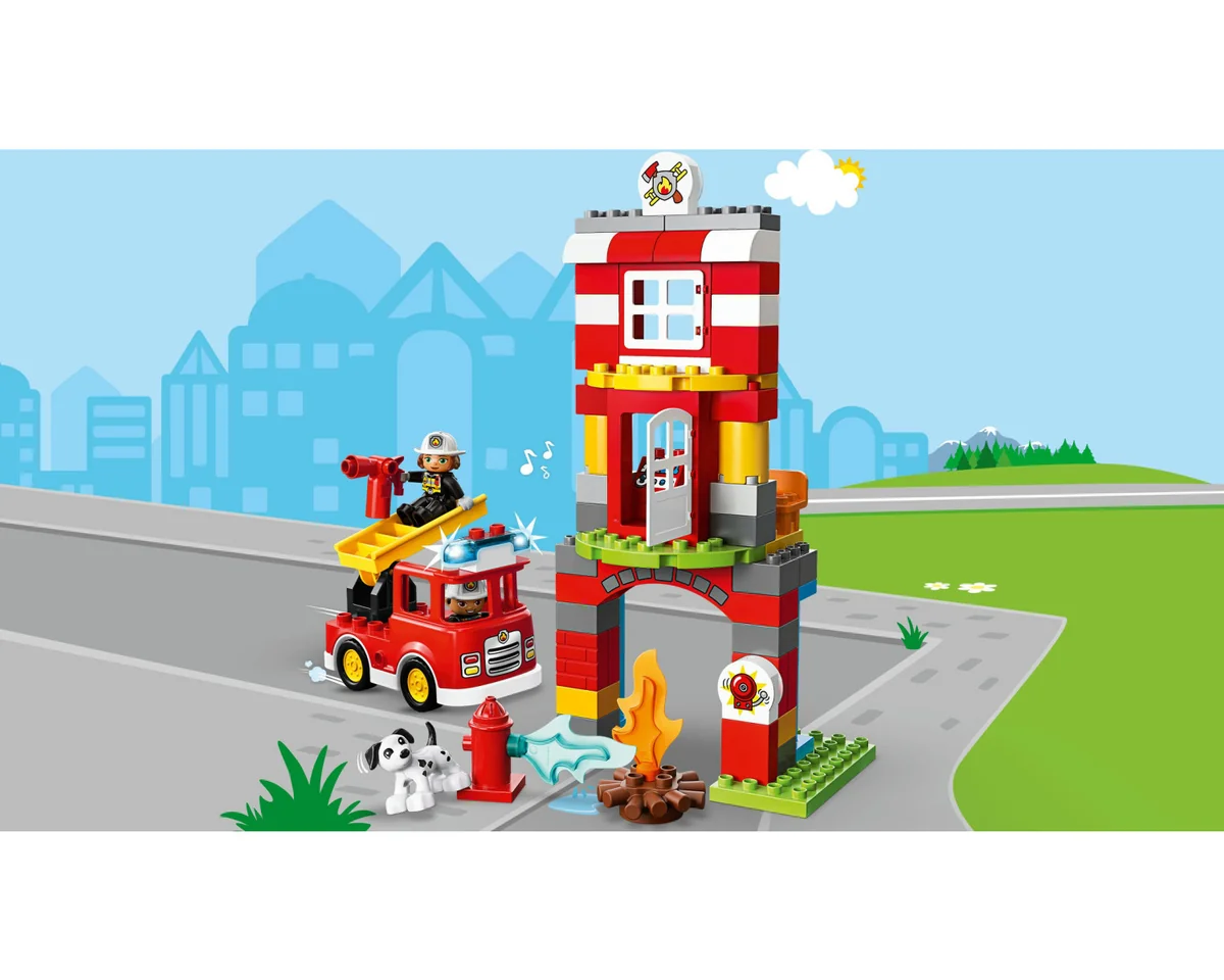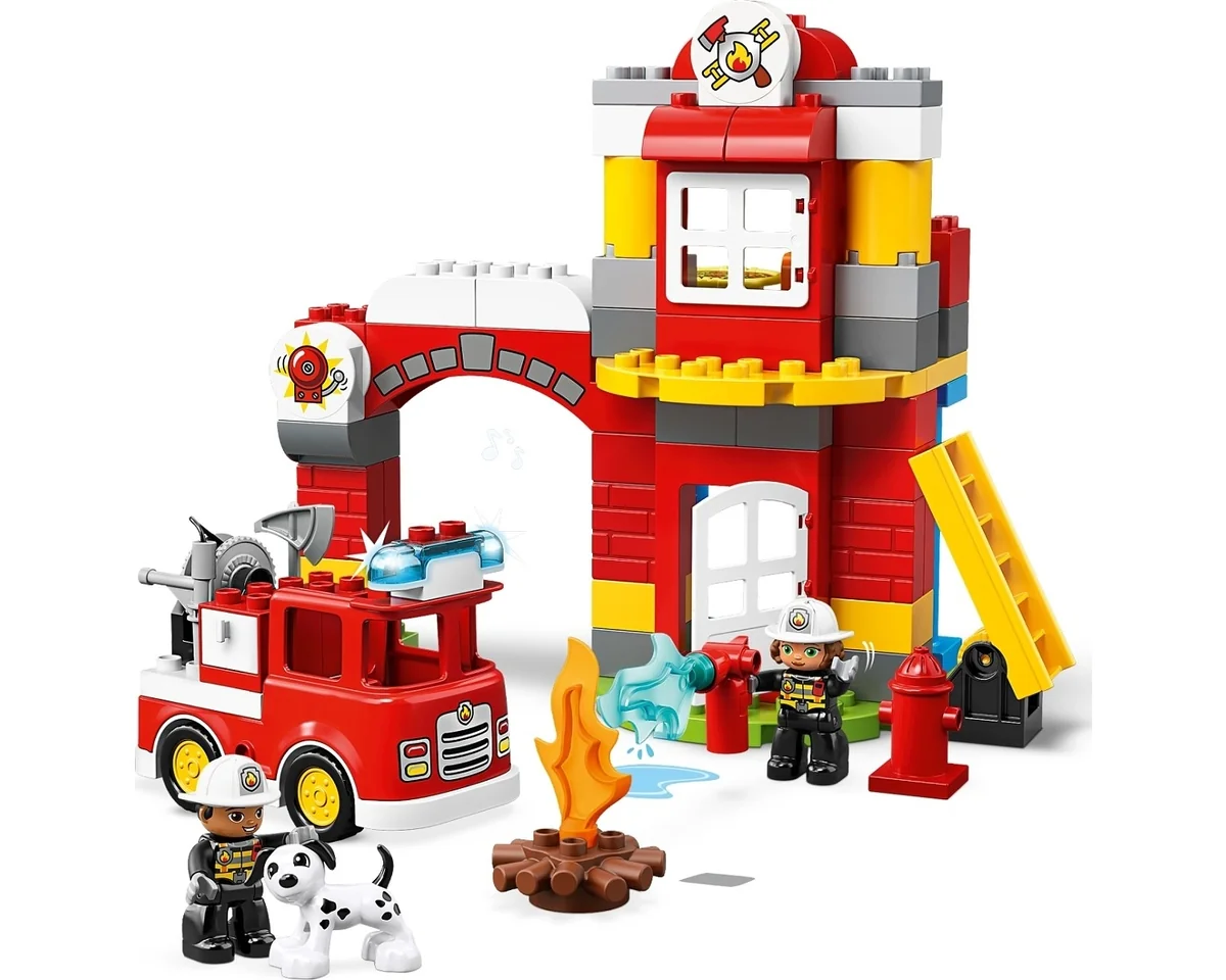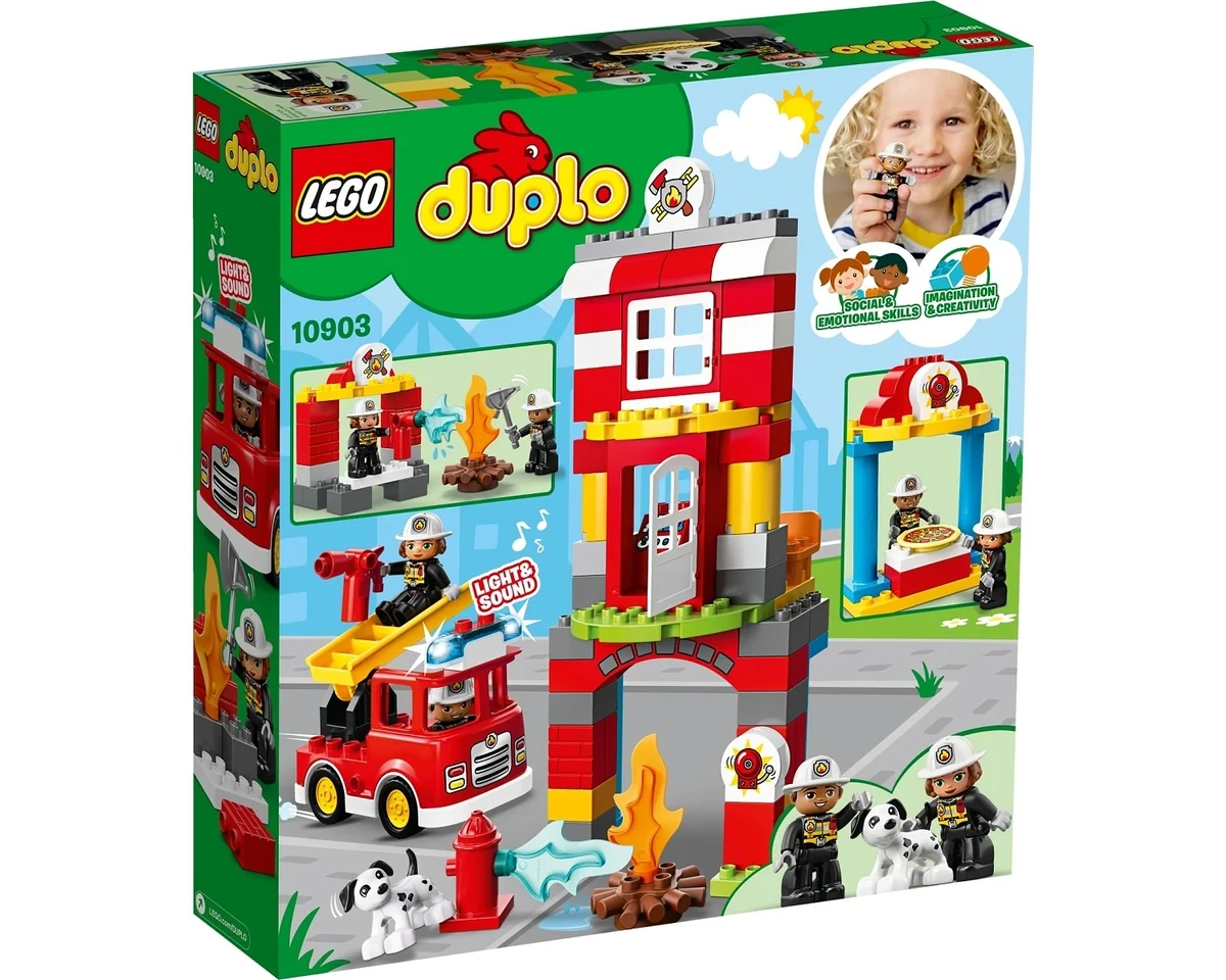 Oändlig fantasifull lek väntar barn i förskoleåldern när brandbilen kör från stationen med blinkande blåljus och siren. Lego DUPLO Town Brandstation 10903 innehåller 76 st bitar och tillverkades 2019. Antal minifigurer i legoförpackningen är 2 st. Brandstation ingår i serien DUPLO Town. Brandstation – Iscensätt verkliga händelser med LEGO® DUPLO® Town: en värld med moderna DUPLO figurer som är lätt att känna igen sig i....