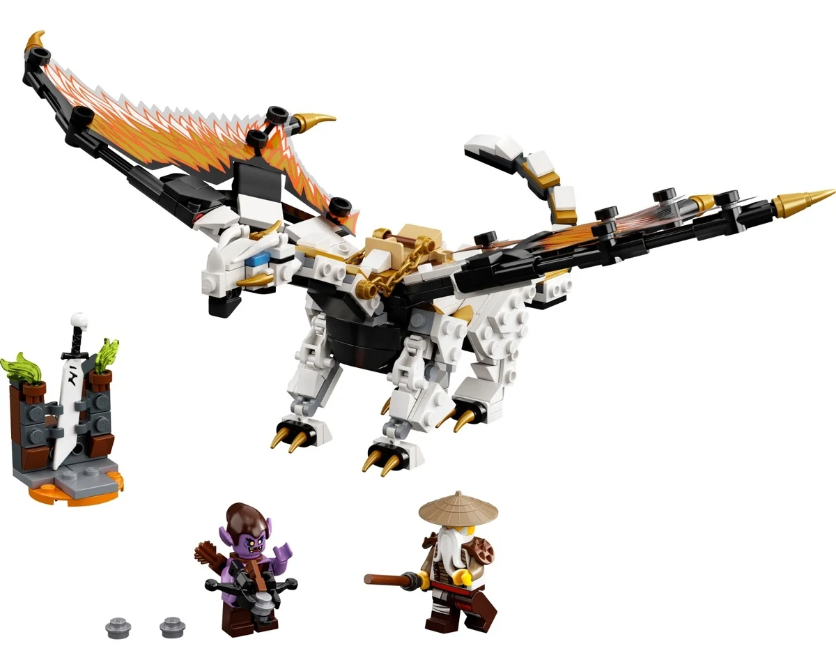 - Detta draklekset innehåller en stridsdrake och 2 minifigurer, Hero Wu och Gleck, och befrielsens elfenbensklinga. Barn kan iscensätta egna roliga berättelser för att se vilken karaktär som segrar!