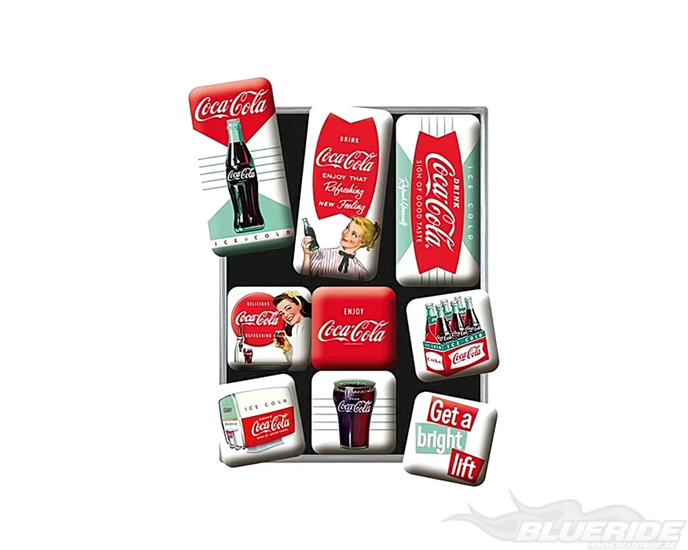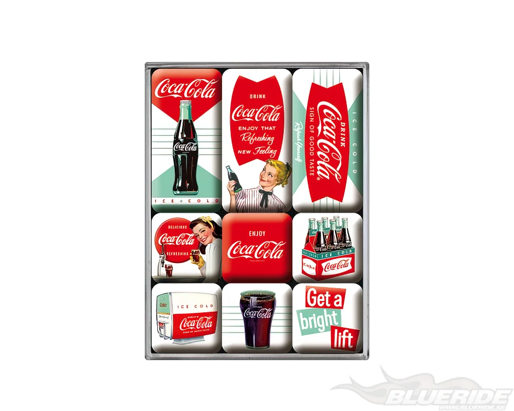Magnetset med 9 st olika magneter med 9 st motiv. Motiven är i klassisk retrostil på reklambilder från Coca-Cola.