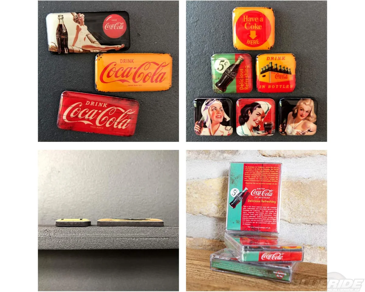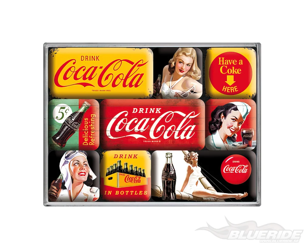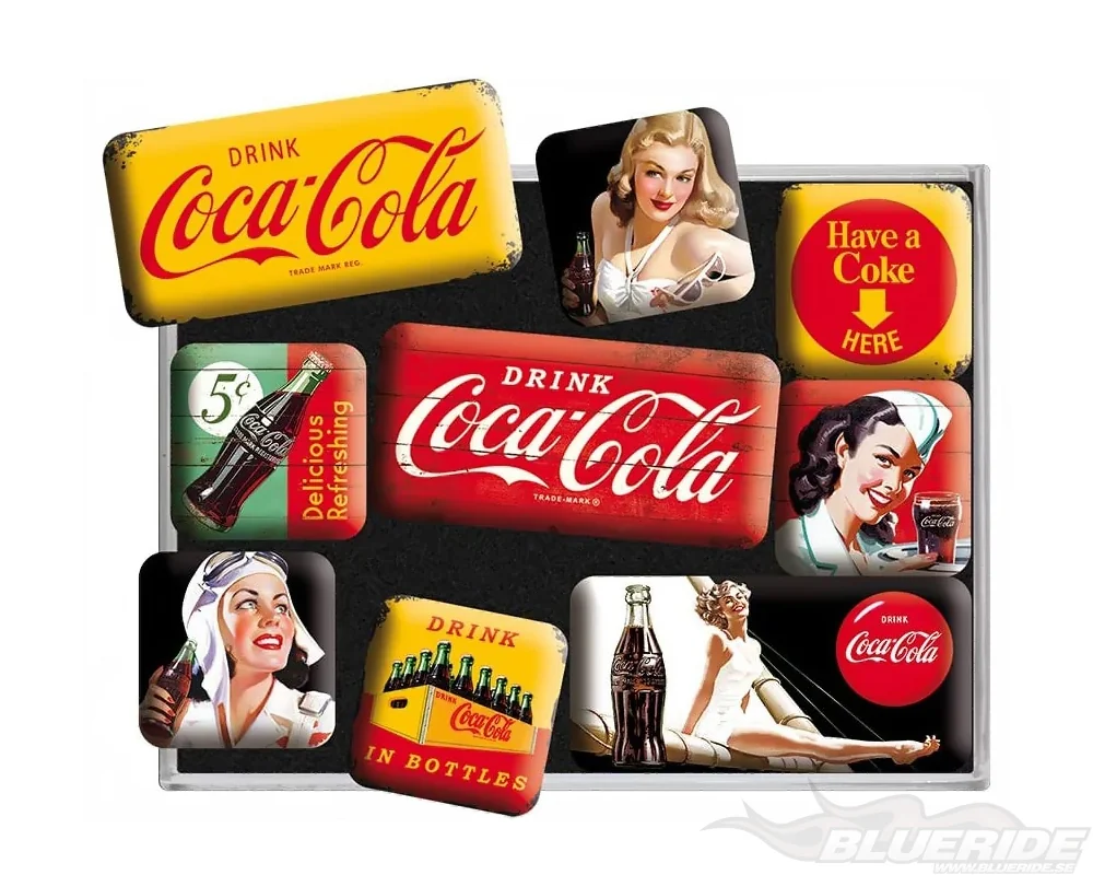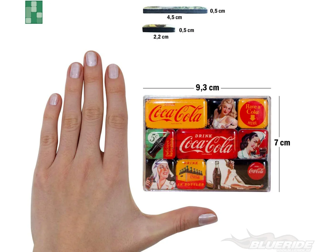Magnetset med 9 st olika magneter med 9 st motiv. Motiven är i klassisk retrostil på reklambilder från Coca-Cola.