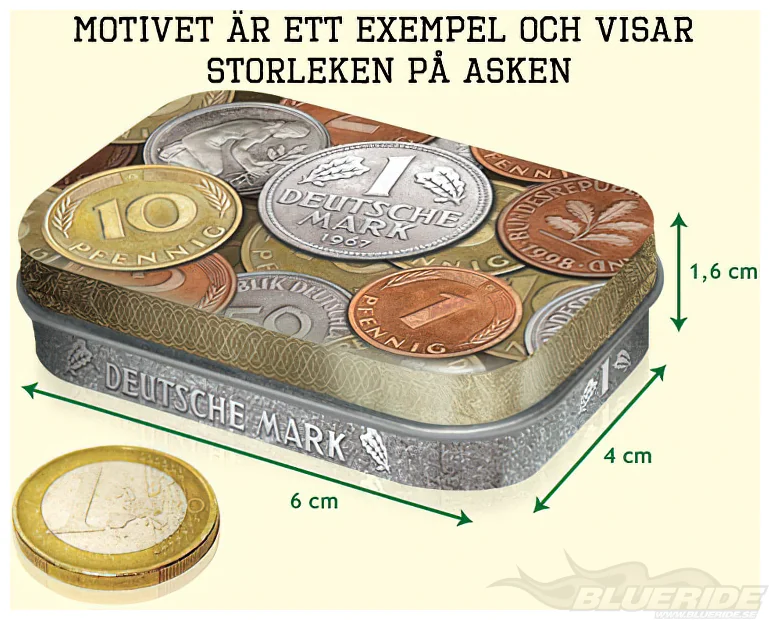 Plåtasken är snygg och välgjord. Locket är stansat för att framhäva motivet. Locket sitter fast med ett litet gångjärn. Trycket är i 4-färg och har riktigt hög finish...