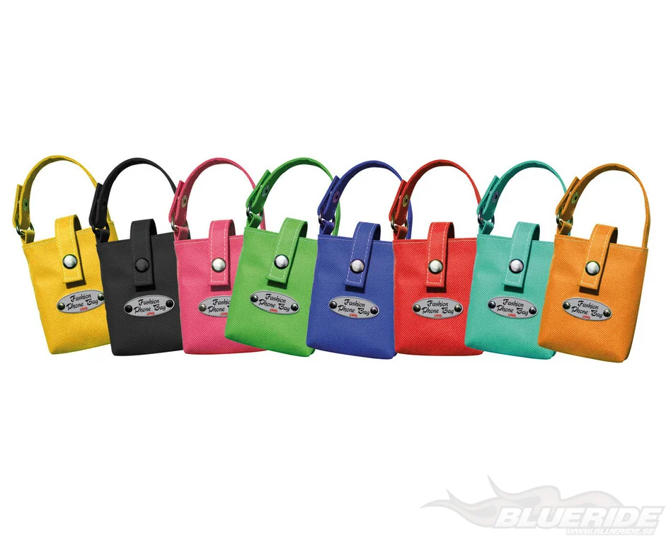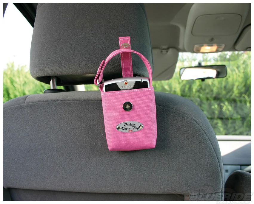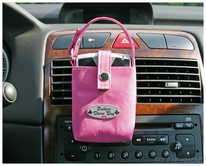Telefon och glasögonhållare utformad som en fashionabel väska. Väskan kan fästas på tre olika sätt, i ventilutblåset/ventilationsuttaget med klipps, med dubbelhäftande tejp eller på nackstödet.