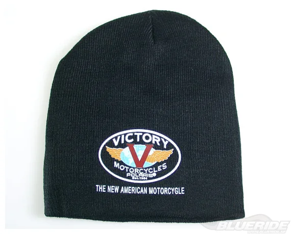 Svart mössa med Victory Motorcycles-loggan i vinyltryck.