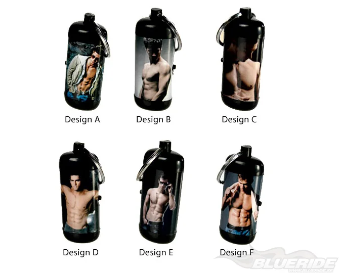 När du trycker på knappen på nyckelringen tänds LED-dioden och om du riktar den mot en yta så projekteras en bild av en lättklädd kille.