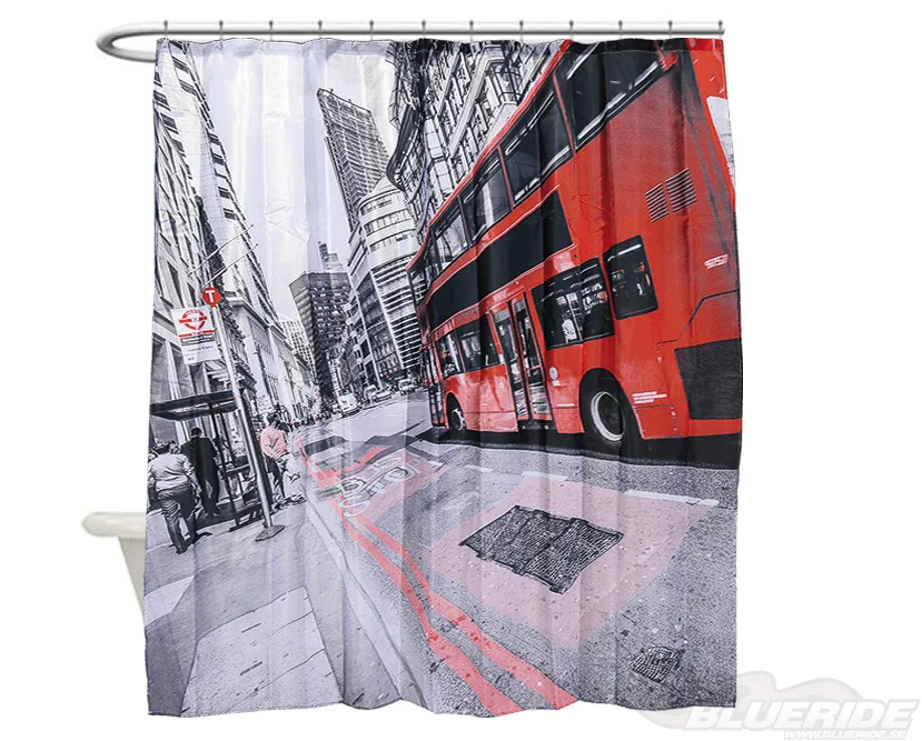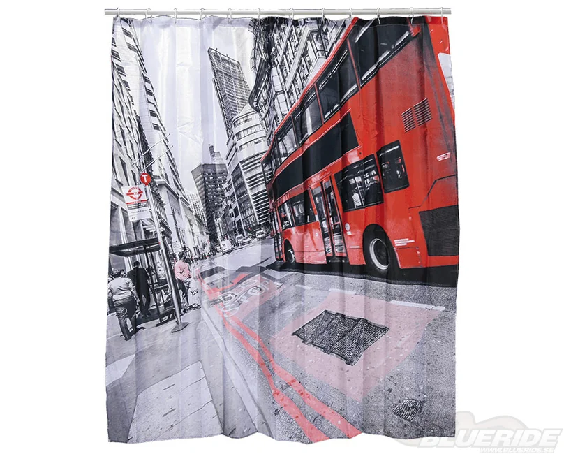 Duschdraperi med ett snyggt och klassiskt motiv från en gata i London med en röd dubbeldäckare, deras kända bussar.