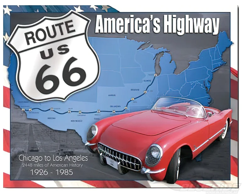 Retro plåtskylt i storleken 41 x 32 cm med motiv av en karta med den klassiska rutten Route 66 som går från Chicago till Los Angeles, en bil och den klassiska Route 66-skylten och med texten ″Americas Highway″.