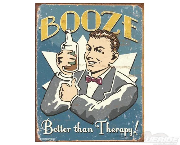 Retro plåtskylt i storleken 32 x 41 cm med texten ″Booze, Better than Therapy!″. Skylten och motivet är i klassisk 50-talsstil.
