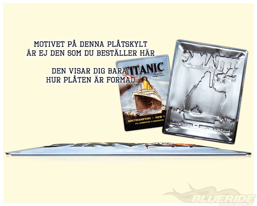 Riktigt snygg plåtskylt som är stansad i konturer. Den är alltså tredimensionell med utbuktningar som framhäver motivet mycket snyggare än en vanlig slät skylt.