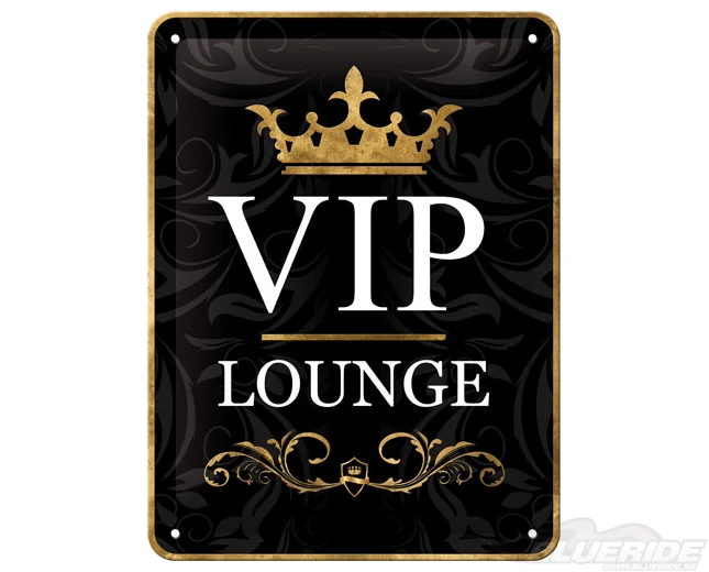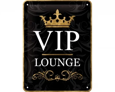 3D-stansad plåtskylt i storleken 15 x 20 cm. Plåtskylten är svart och guld-färgad med ett snyggt motiv samt texten ″VIP Lounge″.