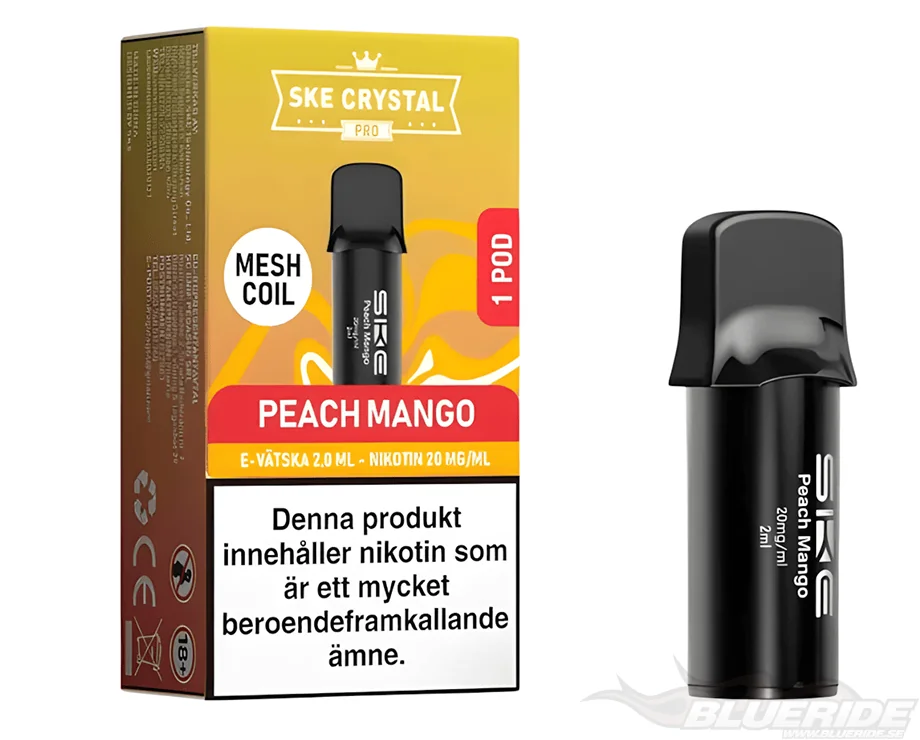 SKE Crystal Max Pro POD Peach Mango är en förfylld pod med 2 ml e-vätska som ger upp till 600 puffar/bloss.