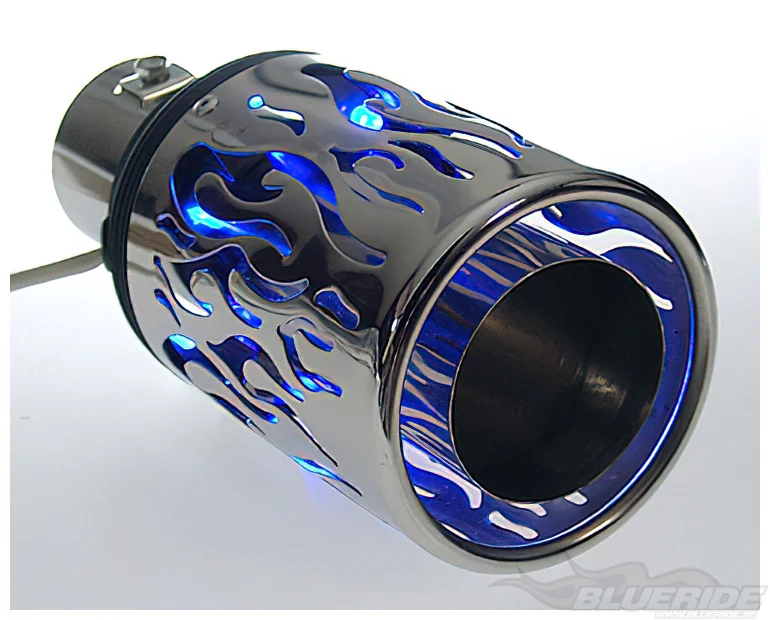 Slutröret har utstansat motiv av eldflammor, detta ger en snygg effekt när de blå led-dioderna lyser inne i slutröret.