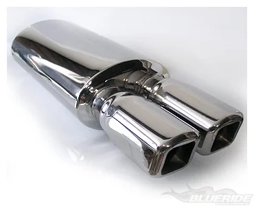 Kromad ljuddämpare i rostfritt stål. Oval dämpare med dubbla snedskurna utblås som har dubbla väggar.