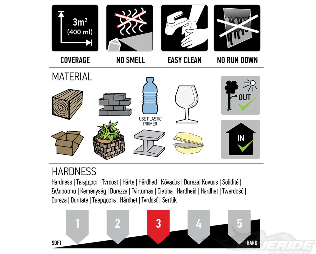 VOC-innehållet har reducerats till 340 g/l vilket gör sprayfärgen flamsäker och produkten mer lätthanterlig.