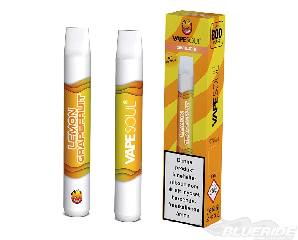 VapeSoul Lemon Grapefruit är underhållsfri engångsvape i premium-klassen med snygg och stilren design formad som en cigarett. Den ger dig upp till 800 puffar/bloss.
