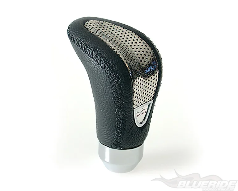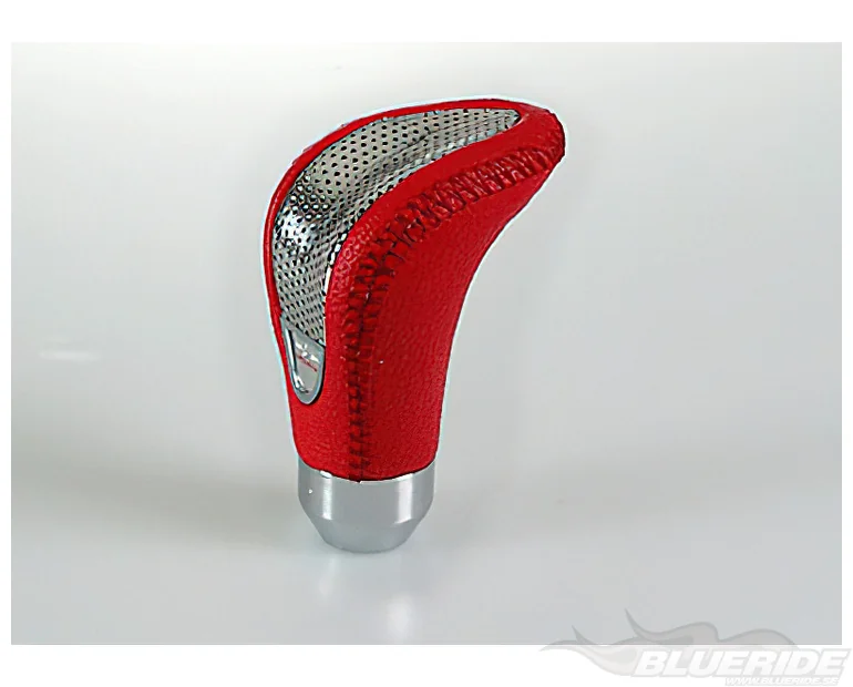 Snygg växelspaksknopp i kromad aluminium och med syntetiskt läder.