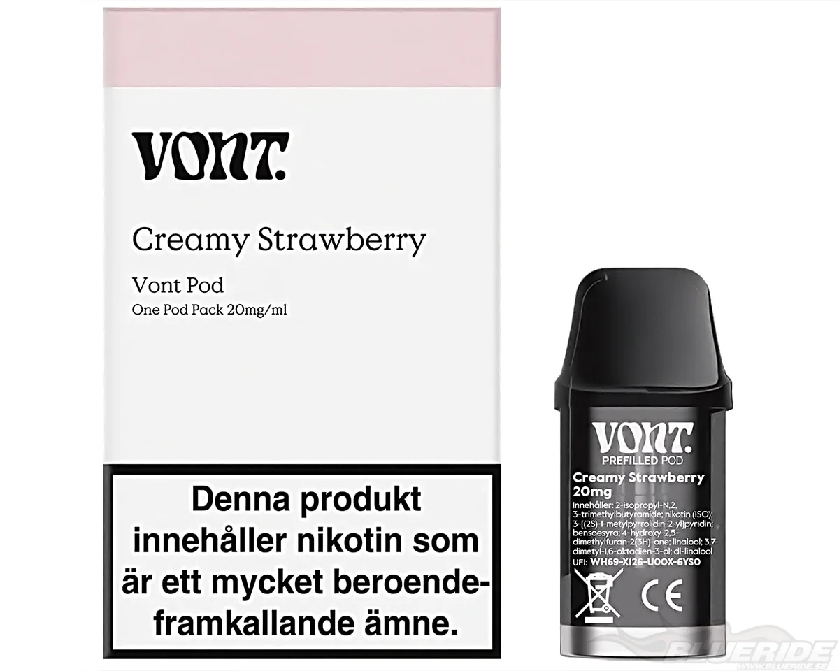 Vont Pod Creamy Strawberry är en förfylld behållare med e-vätska, som ansluts till en Vont POD Device. Den klickas enkelt på plats med magnetfäste och kan användas direkt.