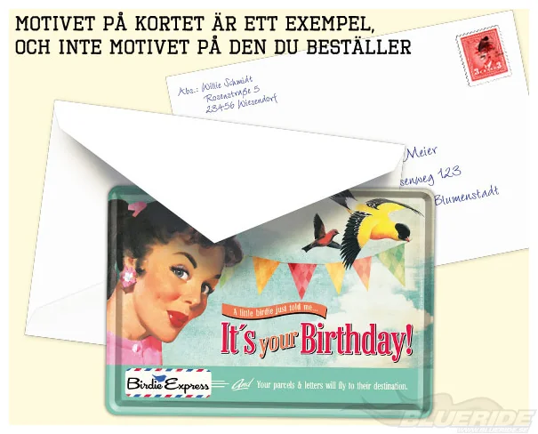 Vykort av det exklusivare slaget. Vykortet är i stansad metall och med ett snyggt tryck. Baksidan är klädd med vanligt papper så du kan skriva på det med en vanlig penna precis som på ett vanligt vykort.