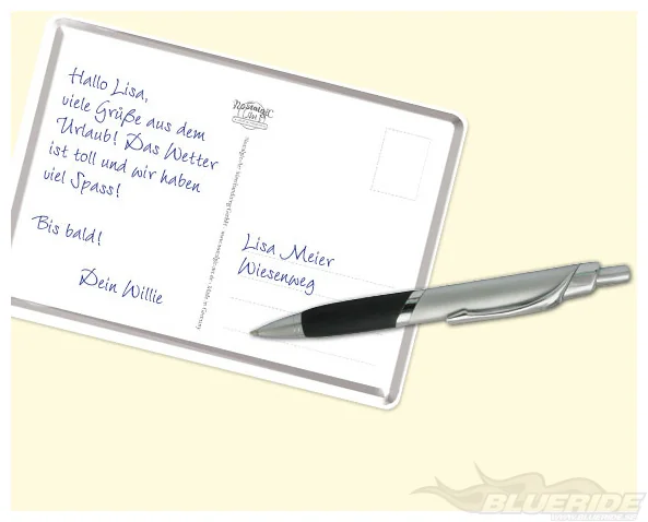Vykort av det exklusivare slaget. Vykortet är i stansad metall och med ett snyggt tryck. Baksidan är klädd med vanligt papper så du kan skriva på det med en vanlig penna precis som på ett vanligt vykort.